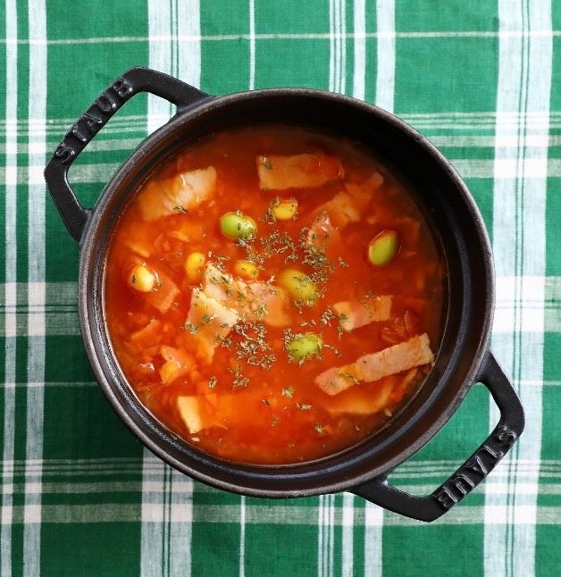 低利用魚のコノシロ(※2)、食品サプライチェーンにおいてさまざまな理由によりフードロスになる可能性のあったトマト果汁、ベーコン、スパイスなどのもったいない食材を活用した冷凍スープです。ABCスタイルにてレシピ開発を行い、冷凍加工を含めた製造は株式会社Tokyo Bento Labo様にご協力いただきました。もったいない食材には海光物産株式会社様、尾家産業株式会社様、株式会社ealo様などの食材を活用しています。